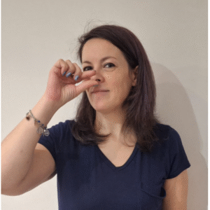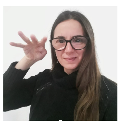 Florencia es oyente, AIE, acompañante terapéutica y logogenista diplomada. Se formó como intérprete de lengua de señas Argentina-español (ILSA.E) y comenzó a dedicarse a brindar servicio a personas sordas, uniendo vocación y preocupación por las problemáticas que pueden aparecer en esta población en torno a los procesos de adquisición del español escrito como segunda lengua, la comprensión lectora y los efectos de la privación lingüística. Cuenta que, siendo muy chica, en una reunión familiar había una pareja de personas sordas y ella se acercó espontáneamente a conocerlos. Desde entonces nunca dejó de estar involucrada con esta comunidad. Su familia —sus hijos— también participan de esa conexión y han estudiado lengua de señas: el mayor es intérprete de lengua de señas y el menor continúa formándose.